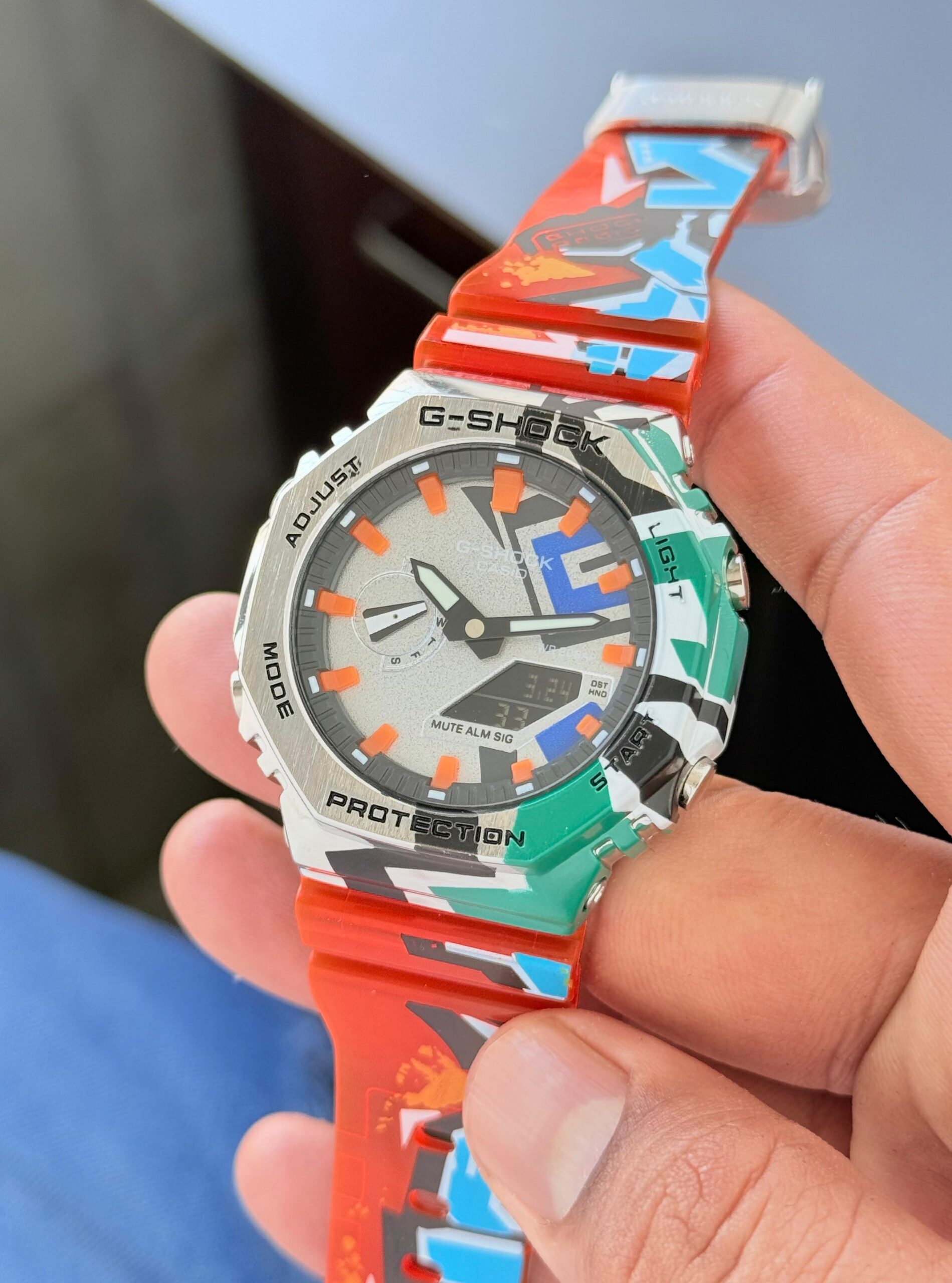 The G-Shock G-Steel GM-2100SS stands out with its bold multi-color design and premium metal construction. Featuring a stainless steel octagonal bezel paired with a vibrant translucent resin strap, this analog-digital watch delivers both durability and street-style appeal. Built with G-Shock’s legendary shock-resistant structure, it is engineered for tough environments while maintaining a slim and comfortable profile. The watch includes 200-meter water resistance, world time, stopwatch, countdown timer, daily alarms, and double LED illumination for enhanced readability. Perfect for collectors and trendsetters, this limited-edition design combines rugged performance with eye-catching modern aesthetics.